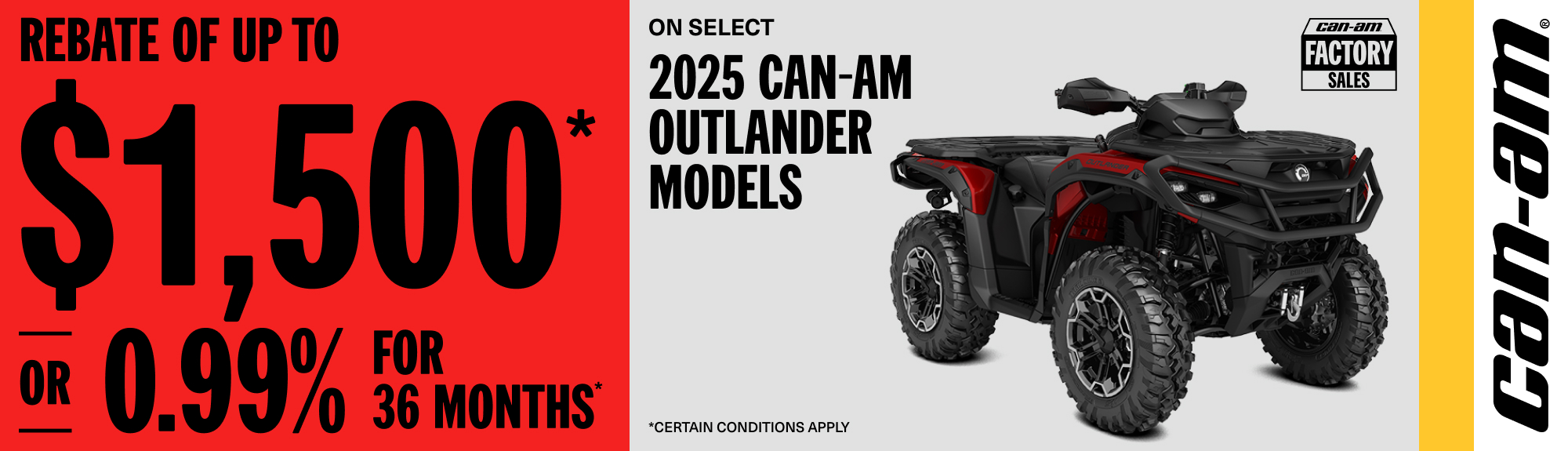 Rebate of up to $1,500 or 0.99% for 36 months on select 2025 Can-Am Outlander models