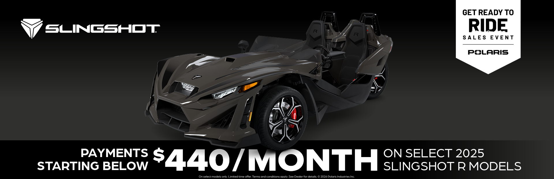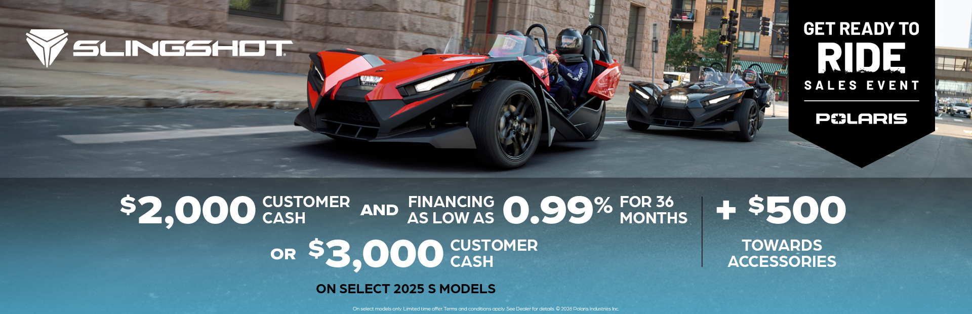 **2025 Model Year Slingshot Family (excluding Slingshot 10) 0.99% APR for 36 Months and $0 Down This is a limited time offer which is valid for the purchase of selected qualifying models and is subject to credit approval on qualified purchases financed during this program. Offer may not be combined with certain other offers, is subject to change and may be extended or terminated without further notice. Offer valid on new 2025 Slingshot® models (excluding Slingshot 10). Monthly payment and cost of borrowing will vary depending on amount borrowed and down payment/trade. Minimum amount to finance is $5,000. Example: $28,299 financed at 0.99% APR over 36 months = 36 monthly payments of $718; financed amount of $25,469 with $2,830 down payment, total cost of borrowing of $390 and a total obligation of $25,860. An example of monthly payments required on a 36-month term at 0.99% APR is $28.20 per $1,000 financed. Monthly payment examples assume 10% down and do not include taxes, title, and other fees. Offer only valid to qualified customers, not all customers will qualify, other offers available, see dealer for details. Offer Valid: March 1 – 31, 2026.