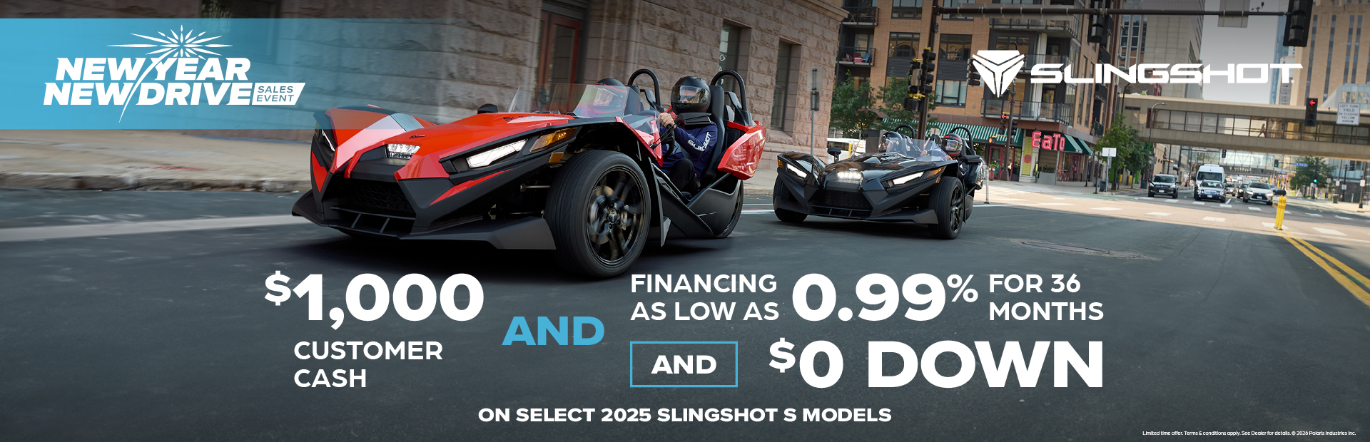 This is a limited time offer which is valid for the purchase of selected qualifying models and is subject to credit approval on qualified purchases financed during this program. Offer may not be combined with certain other offers, is subject to change and may be extended or terminated without further notice. Offer valid on new 2025 Slingshot® models (excluding Slingshot 10). Monthly payment and cost of borrowing will vary depending on amount borrowed and down payment/trade. Minimum amount to finance is $5,000. Example: $28,299 financed at 0.99% APR over 36 months = 36 monthly payments of $718; financed amount of $25,469 with $2,830 down payment, total cost of borrowing of $390 and a total obligation of $25,860. An example of monthly payments required on a 36-month term at 0.99% APR is $28.20 per $1,000 financed. Monthly payment examples assume 10% down and do not include taxes, title, and other fees. Offer only valid to qualified customers, not all customers will qualify, other offers available, see dealer for details. Offer Valid: January 1 – 31, 2026.